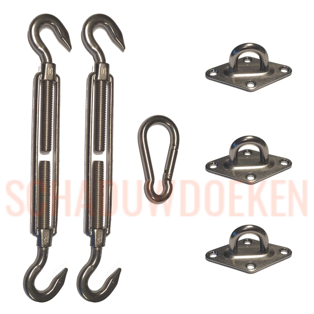 De complete bevestigingset bestaat uit twee M10 spanhaken, één M8 karabijnhaak en drie oogplaten. Dit is alles wat je nodig hebt om een schaduwdoek te monteren.