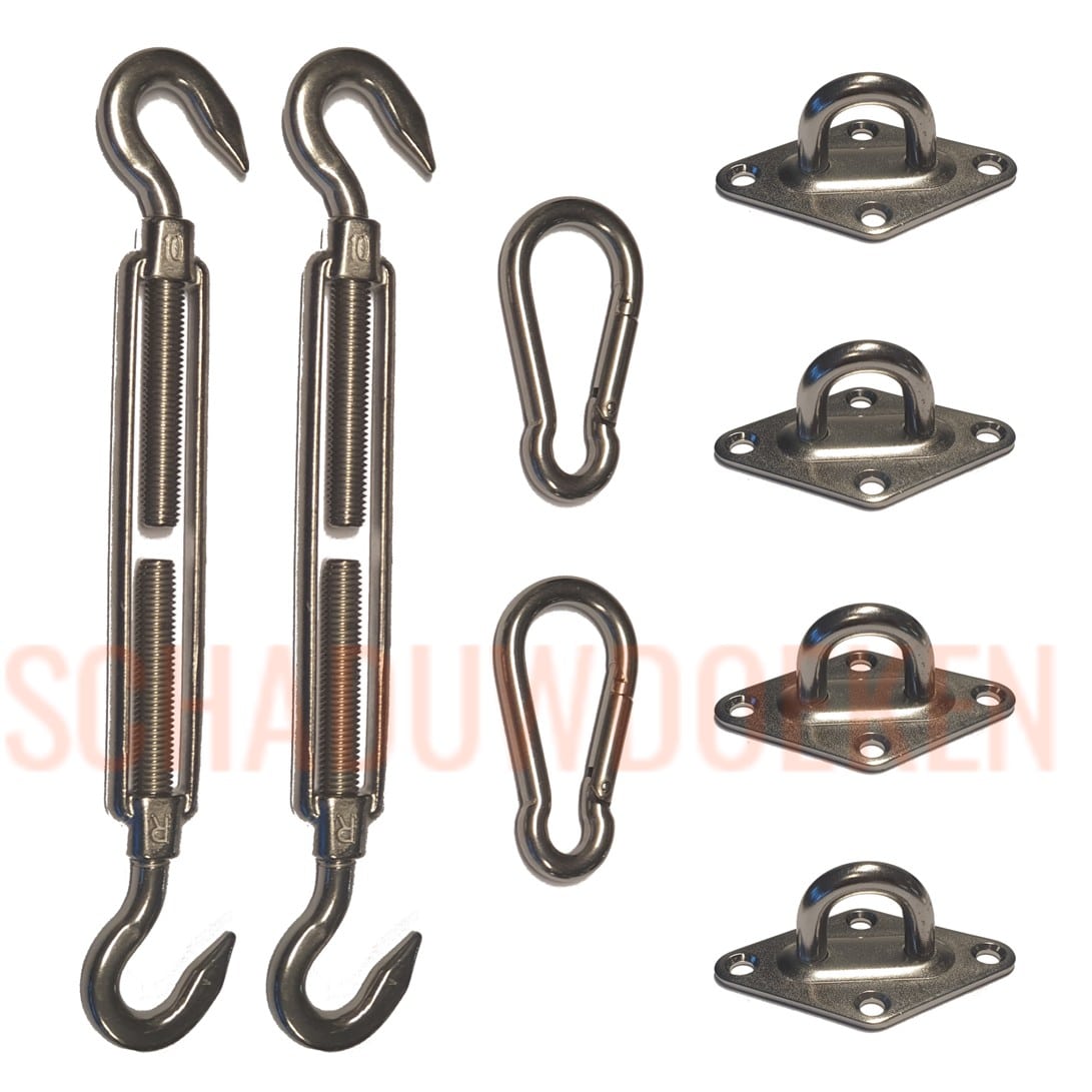 De complete bevestigingset bestaat uit twee M10 spanhaken, twee M8 karabijnhaak en vier oogplaten. Dit is alles wat je nodig hebt om een schaduwdoek te monteren.