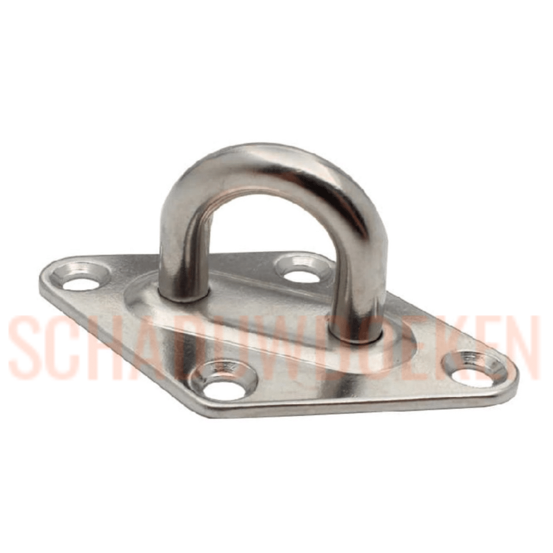 Een oogplaat kan op steen/beton of op hout geboord worden. Aan de oogplaat kan dan de karabijnhaak of spanhaak gehaakt worden.